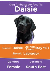 Hi everyone, I am very excited to introduce myself to you all. I am Daisie a fun, eager and loving black Labrador. I was on my way to becoming a jacket Canine Partner, but I found change little challenging and preferred to be with one person. However, I am such a keen worker, and a space became available within the Dog Ambassador Team in 2020 and I was living with Partnership Trainer Ellie whilst she helped to support me with change and it just seemed like the perfect fit to stay and join the team 😊